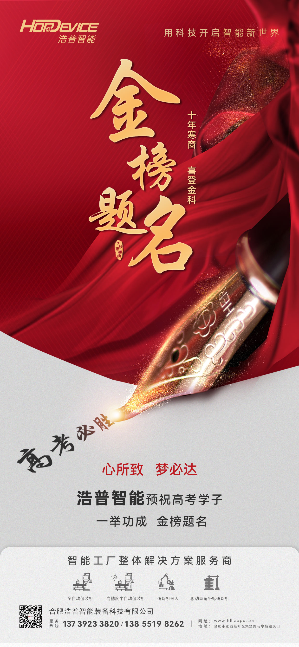 在這個陽光明媚的六月,我們迎來了一年一度的高考。對于無數(shù)學(xué)子來說,這不僅是一場知識的考驗,更是一場青春的洗禮,一場智慧的較量。浩普智能,作為一家致力于科技創(chuàng)新和智能智造的企業(yè),我們深知智慧和勇氣的重要性。在此,浩普智能向每一位踏入考場的學(xué)子致以最誠摯的祝愿,祝愿所有參加高考的學(xué)子們,旗開得勝,金榜題名!